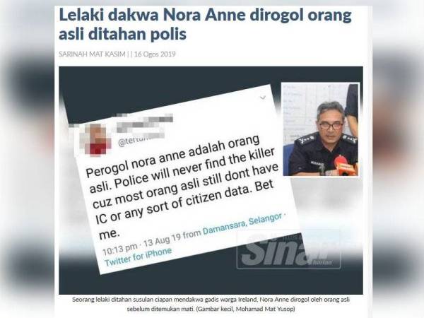 Pada 16 Ogos lalu media melaporkan bahawa polis menahan seorang lelaki berusia 29 tahun yang dipercayai mempunyai kaitan dengan ciapan di laman sosial mendakwa remaja warga Ireland, Nora Anne Quoirin, 15, dirogol orang asli.