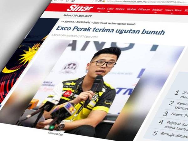 Howard Lee, yang juga Exco Pembangunan Belia dan Sukan Perak dalam kenyataan berkata ancaman tersebut diterima melalui tangkap layar satu kumpulan WhatsApp dan dihantar kepadanya.