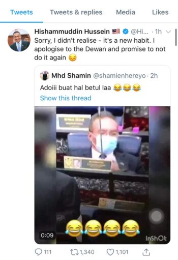 MENTERI Luar Negeri Hishammuddin Hussein memohon maaf selepas videonya menghisap vape di Dewan Rakyat hari ini tersebar. “Maaf, saya tidak menyedarinya (kerana) ia tabiat baharu. Saya minta maaf kepada Dewan Rakyat