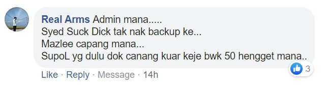 ‘Real Arms- Admin mana…. Syed Suck Dick tak nak backup ke… Mazlee capang mana… SupoL yg dulu dok canang kuar keje bwk 50 hengget mana…’