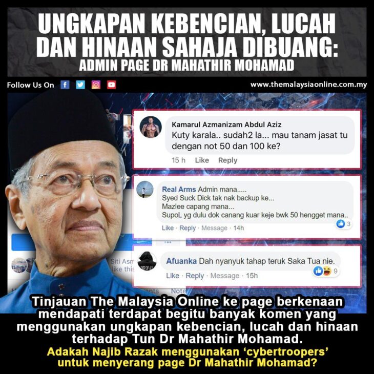 Tinjauan The Malaysia Online ke page berkenaan mendapati sememangnya terdapat begitu banyak komen yang menggunakan ungkapan kebencian, lucah dan hinaan terhadap Tun Dr Mahathir Mohamad.