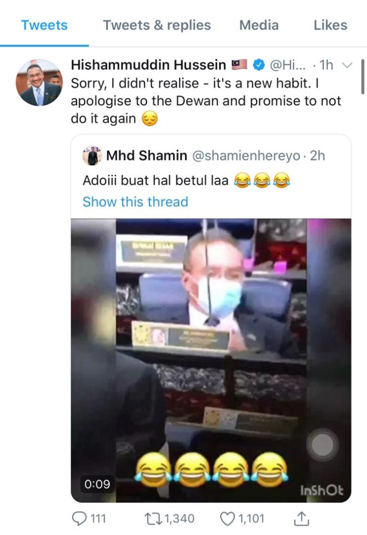 “Maaf, saya tidak menyedarinya (kerana) ia tabiat baharu. Saya minta maaf kepada Dewan Rakyat dan berjanji tidak akan melakukannya lagi,” tulisnya di Twitter.