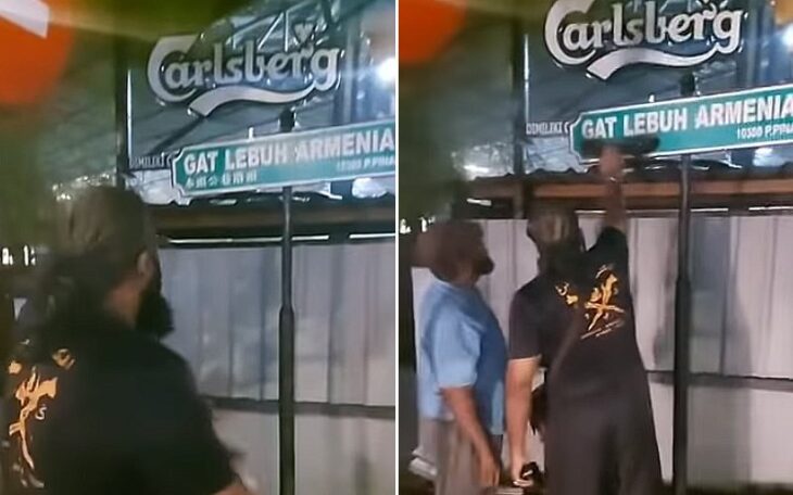 Firdaus dan Azmi dilihat menerusi perkongsian di media sosial menyembur cat pada tulisan Cina papan tanda jalan di kawasan warisan pada malam Ahad, mengatakan hanya Bahasa Melayu boleh digunakan kerana bahasa rasmi.
