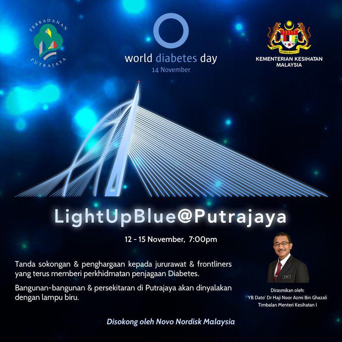 Ia menyaksikan bangunan dan persekitaran di Putrajaya diterangi cahaya biru “sebagai tanda sokongan dan penghargaan kepada jururawat dan barisan hadapan yang terus memberikan perkhidmatan rawatan diabetes”.